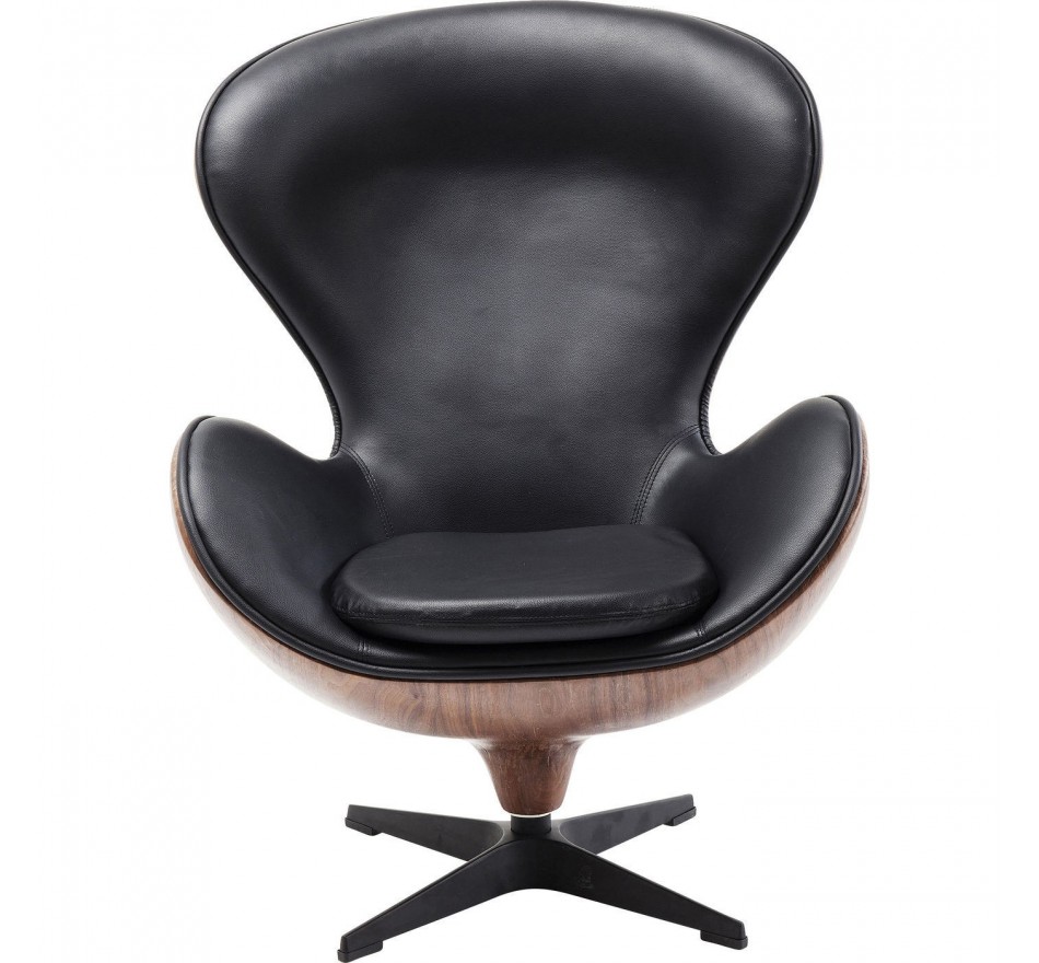 This swivel chair is composed of an inner face in reconstituted leather and an external face in MDF perched on a lacquered steel foot. It can be placed in a contemporary interior and can be placed in front of a desk.