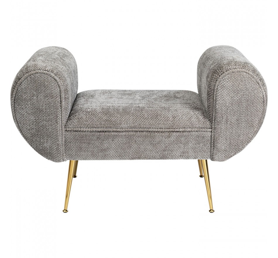 This bench makes a statement with its wide armrests combined with grey velvet woven fabric and gold steel legs.