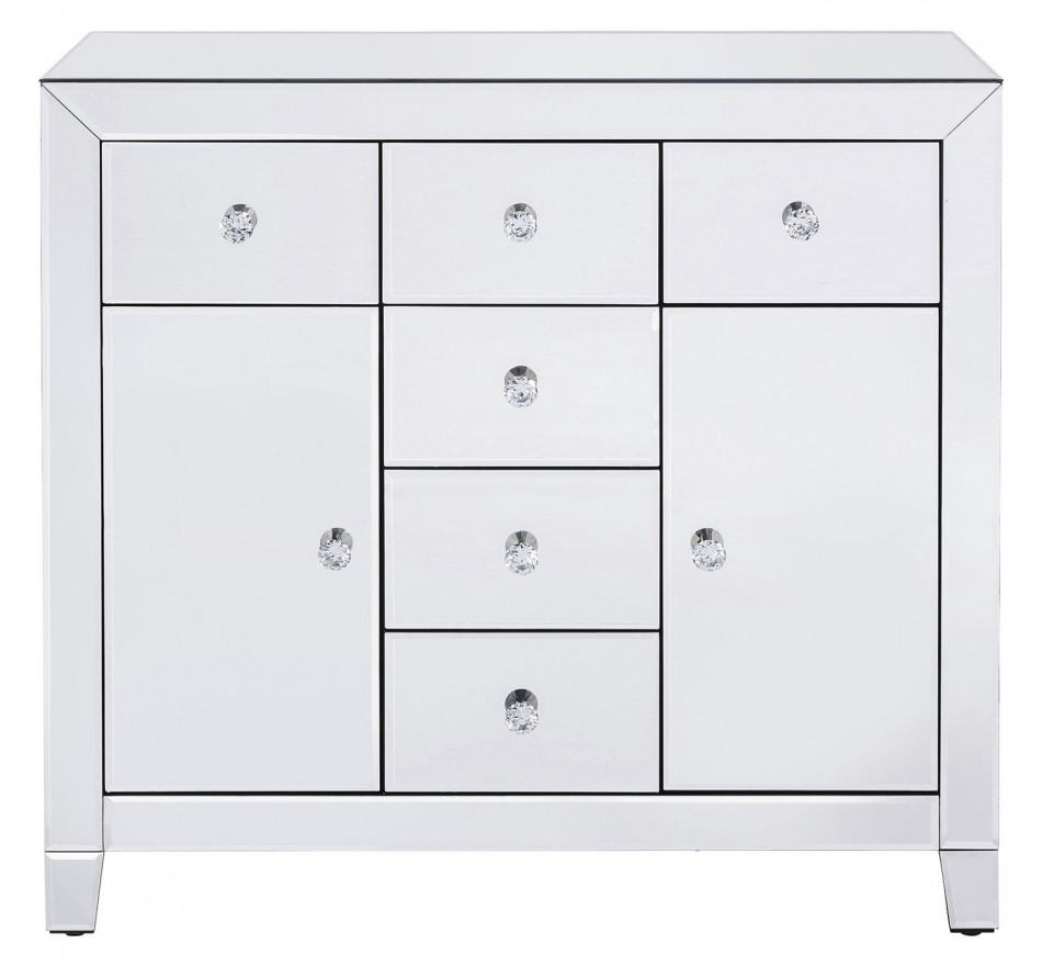 This chest of drawers has a modern and refined look and is made of a lacquered compressed wood structure and mirror panels. Its six drawers and two doors open thanks to glass handles reminiscent of diamonds. Its storage space allows it to be used as a chest of drawers in a bedroom or entrance hall but also as a sideboard in a small living room.