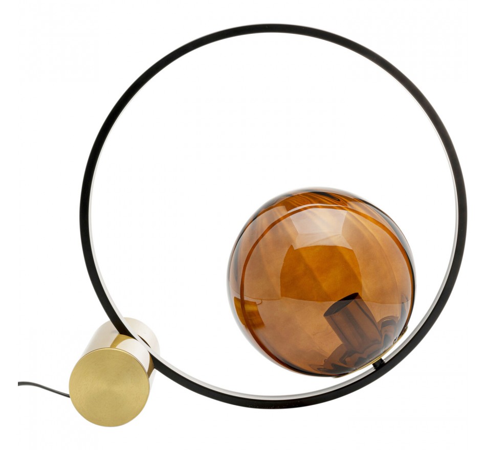 Let yourself be seduced by this boldly designed lamp: a black steel circle houses a brown glass sphere, where the lampholder hides. The whole is held in place by a golden cylindrical base that balances the whole.