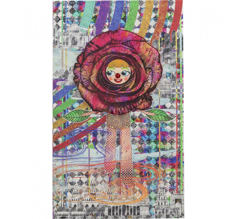 Dit schilderij toont een jong meisje met haar gezicht omringd door rozenblaadjes en bladeren in plaats van armen. De veelkleurige penseelstreken, gebouwen en diamanten op de achtergrond voegen dynamiek toe. Het is een mix van poëzie en gebladerte die perfect is om wat pit aan je inrichting te geven!