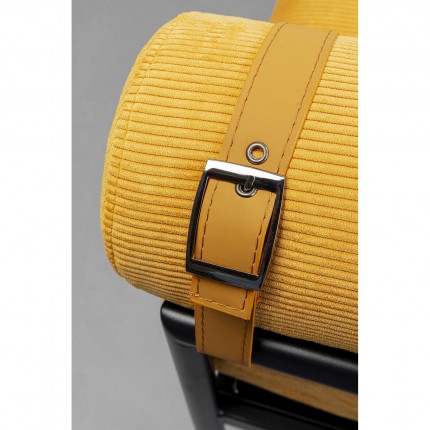 Deze gele bank komt pas echt tot zijn recht met zijn cilindervormige kussens, die kunnen worden vastgebonden en losgemaakt om als armleuningen te dienen. De levendige gele kleur voegt een vleugje plezier en energie toe aan je ruimte.