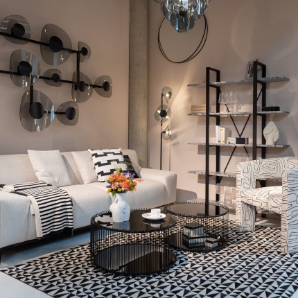 Deze plank heeft een eigentijdse stijl met zijn grijs en wit gemarmerde granieten blad. Dit granieten oppervlak wordt gecombineerd met twee rechthoekige zwarte stalen poten.