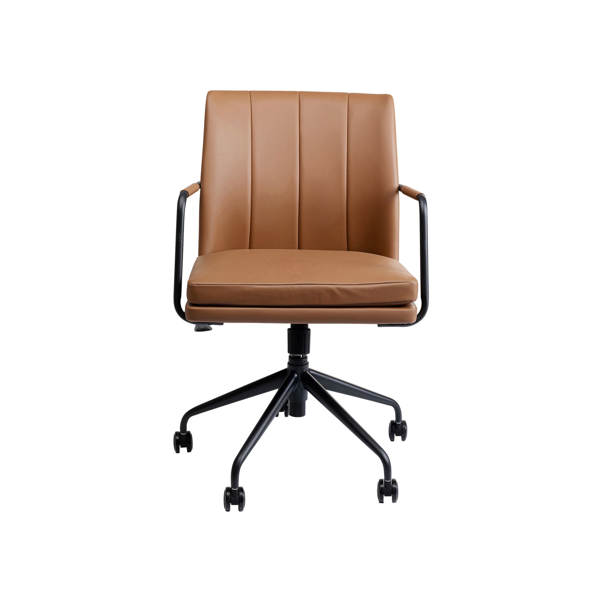 Deze op vintage geïnspireerde bureaustoel speelt in op het contrast tussen de imposante bruine imitatiezitting en de slanke lijnen van de armleuningen en het onderstel. Naast zijn tijdloze stijl heeft hij alles wat je je maar kunt wensen: wielen, draai-, kantel- en hoogteverstelling!
