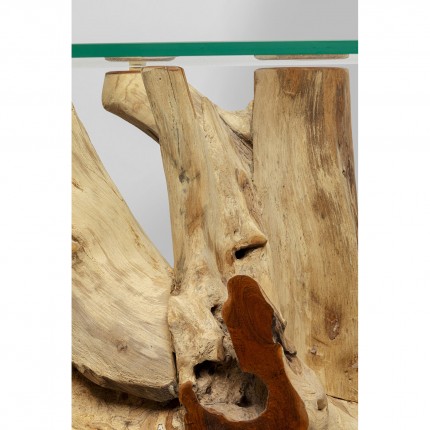 De console wordt geleverd met een glazen blad van 10 mm dat op de poten kan worden geplaatst. Het teakhouten onderstel is voor elk model anders. Elk meubel is dus uniek. Maximaal draagvermogen: 25 kg.
