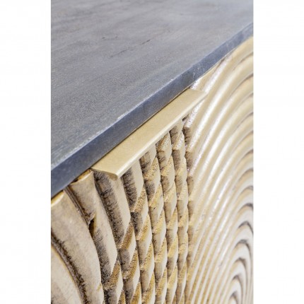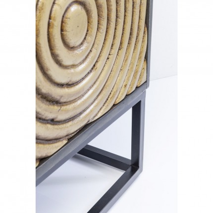 Dit dressoir met een eigentijds ontwerp combineert een acaciastructuur met een mangoboomfront, beide gelakt, gemonteerd op een stalen sokkel. De drie deuren, die met een vingerafdruk opengaan, zijn versierd met cirkels in reliëf.