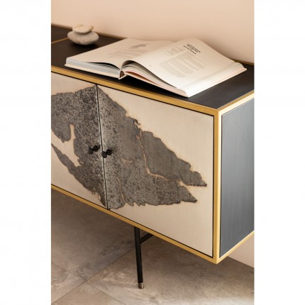 Dit dressoir is in een eigentijdse stijl met motieven op de deuren die doen denken aan vulkanisch gesteente. De bronzen afwerking die de structuur onderstreept, contrasteert met de rauwe esthetiek en geeft het een elegante uitstraling. Elke set deuren opent naar een grote opbergruimte met een plank. Elk stuk van dit dressoir is uniek.