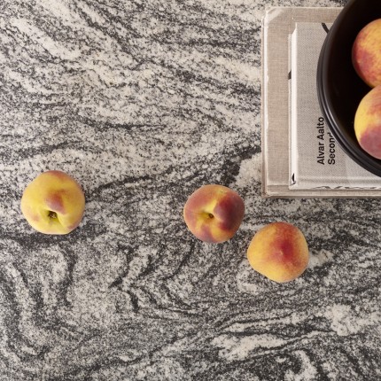 Deze eettafel heeft een eigentijdse stijl met zijn grijs en wit gemarmerd granieten blad. Het granieten oppervlak wordt gecombineerd met vier driehoekige zwarte stalen poten.