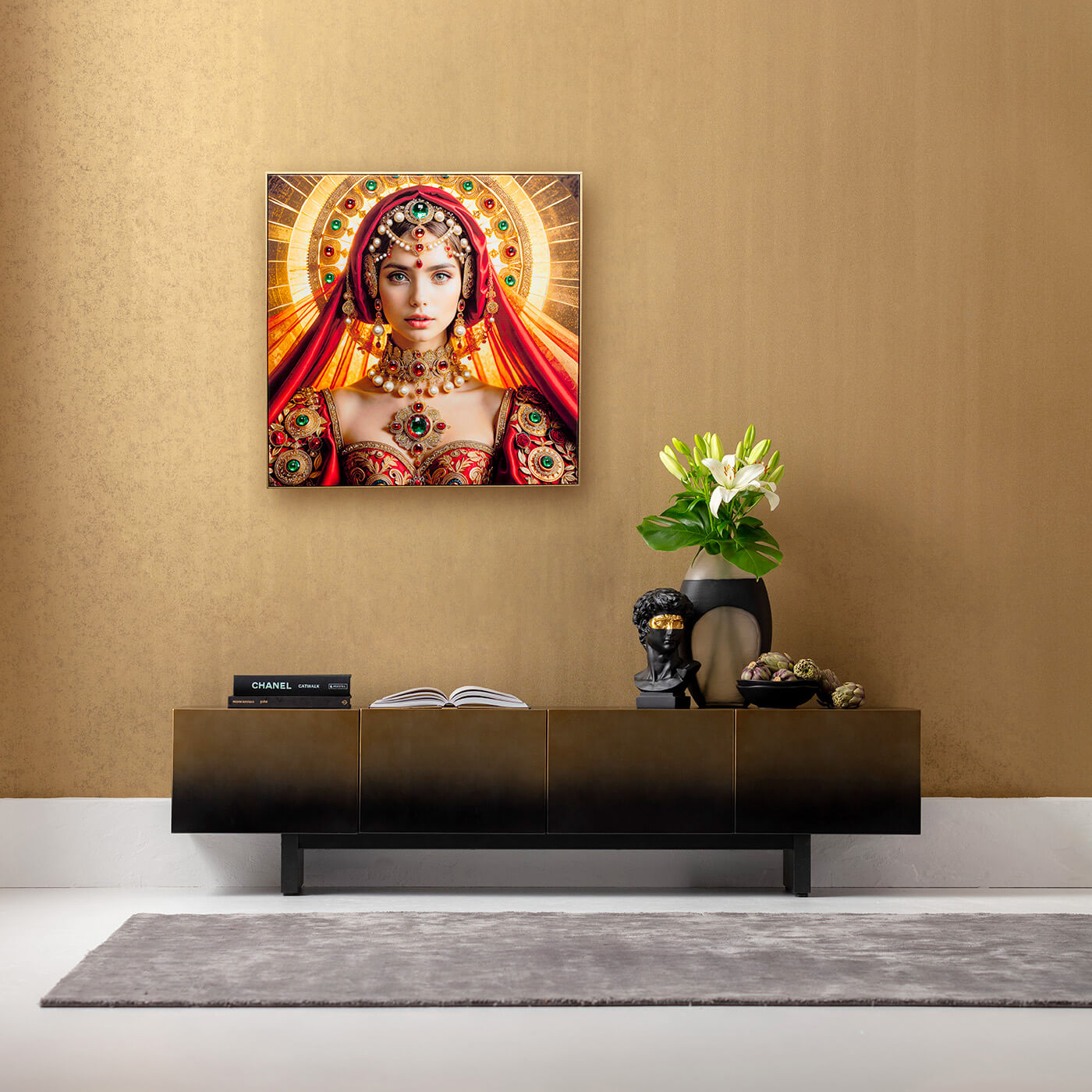 • Impressive cotton canvas with feminine motif in gold and red, 100 x 100 x 5 cm.