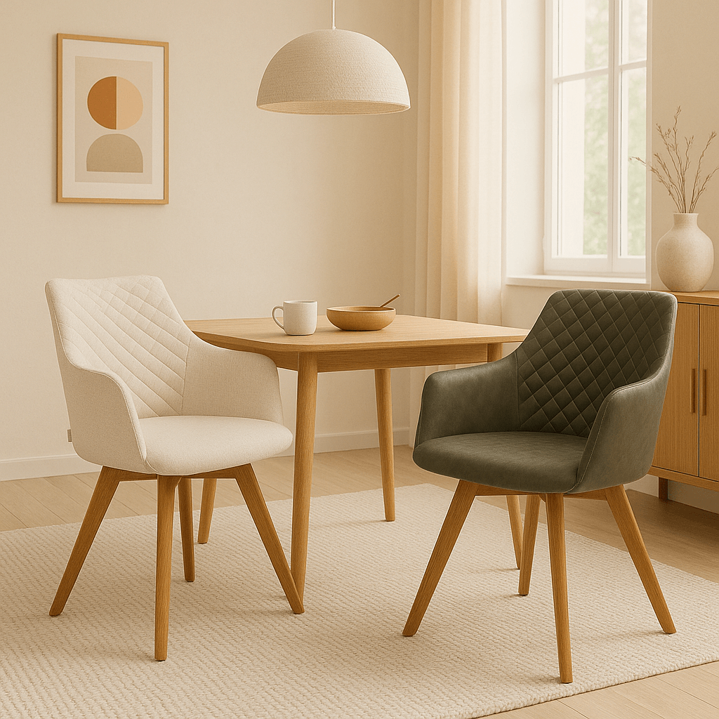 This table chair swivels 180°, so it can also be used as an office chair. With its "reset" function, it automatically returns to its initial position. With its padded seat and oak legs, it's part of a Scandinavian style.