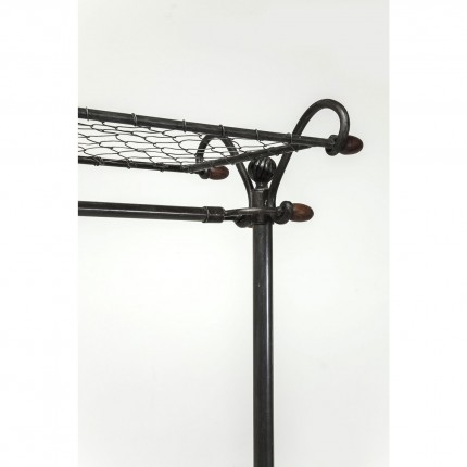 This coat rack has a vintage aesthetic with its steel frame complemented by wooden accents. Your jackets and clothes find their place on the 12 included hangers while the two shelves, made of wood at the bottom and wire mesh at the top, hold shoes, bags and storage boxes.