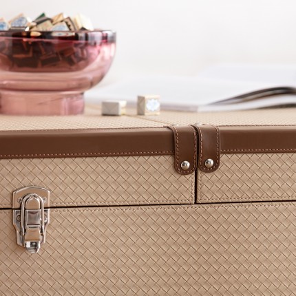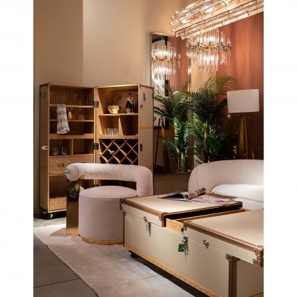 This coffee table that also doubles as a bar is a real showpiece. Various compartments and bottle holders as well as a removable tray are located inside the chest. Its beige woven leatherette covering is easy to clean.