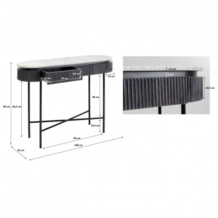 This console stands out with its rounded shape inspired by retro style. Designed with a white marble top, this piece contains two drawers for efficient storage. The vertical details of the lower part of the furniture create a relief effect that contrasts with its curved silhouette. Do not hesitate to combine it with the two sideboards or the TV stand of the same collection for a harmonious interior!