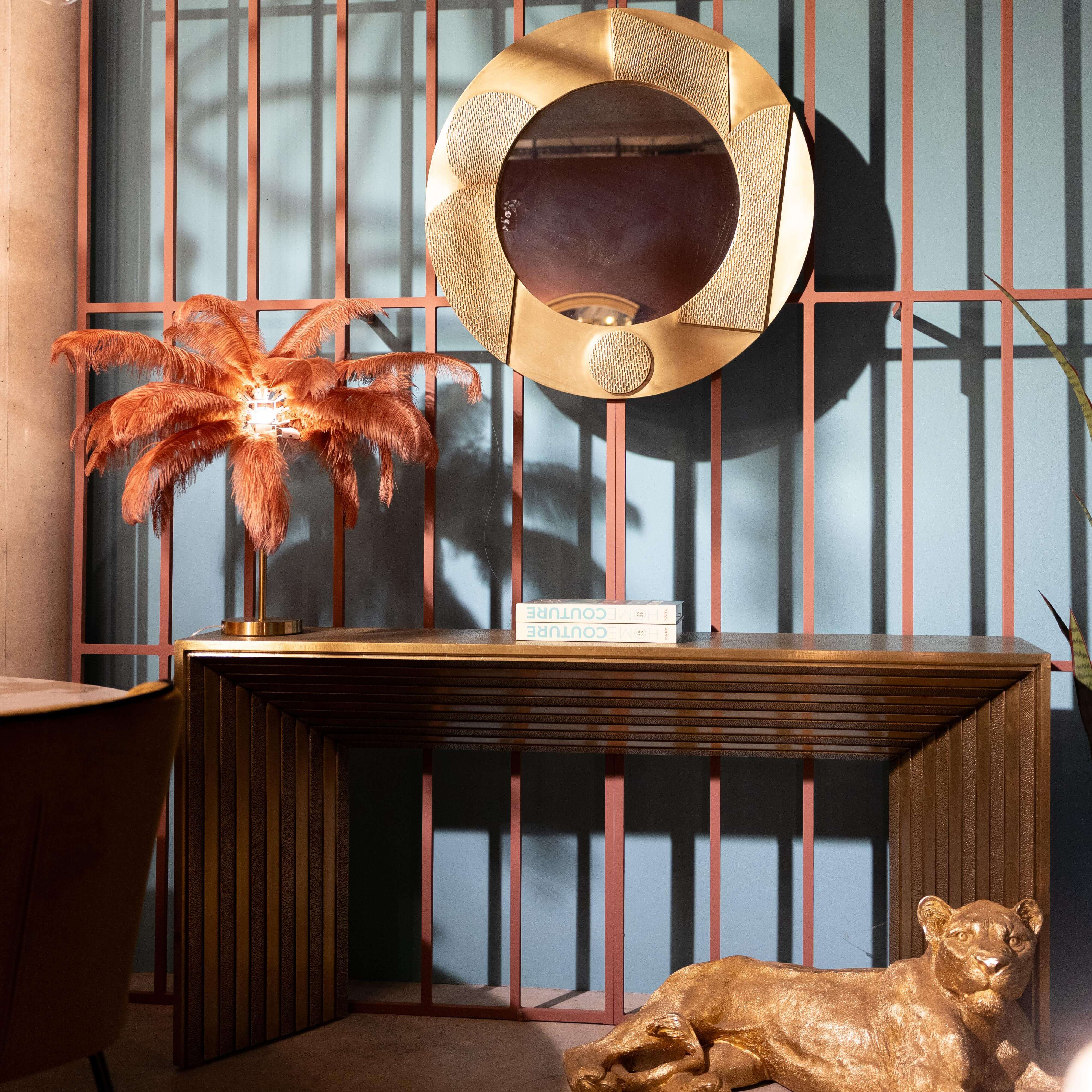 This spectacular on Gold console catches the eye with its unusual graphic design. The partially hand-crafted metal front (covered in brass) produces sensational visual effects and brings modernity and luxury to your interior. Once stocked with bottles and glasses, this narrow table transforms into an indoor bar with style.