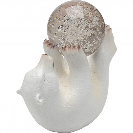 This decoration features a polar bear, lying on its back, playing with a glass sphere balanced on its 4 paws.