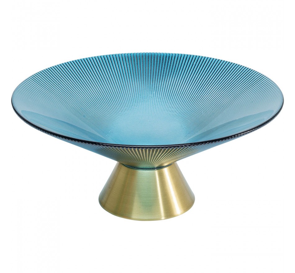 This bowl is made of blue tinted glass with stripes assembled to a golden steel base. The combination of colors and materials creates a chic look.