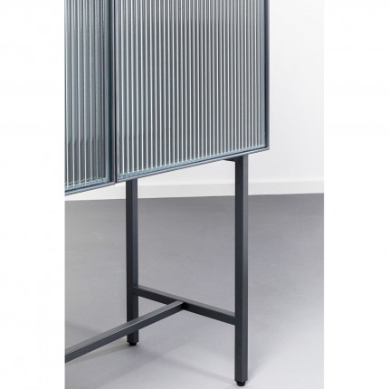 This showcase offers practical storage space for your essential items. Its textured tempered glass doors add an intriguing visual dimension, while showcasing your decorative items or tableware inside. The contrast between black steel and opaque glass creates a harmonious visual balance.