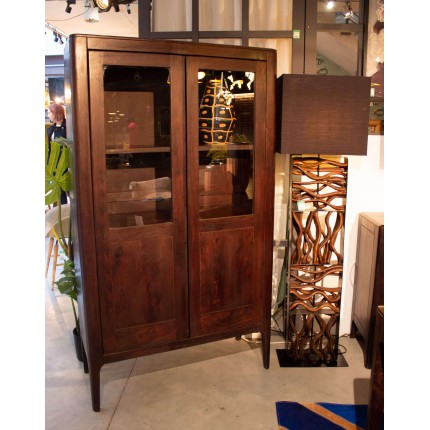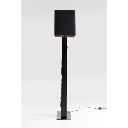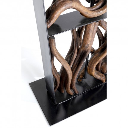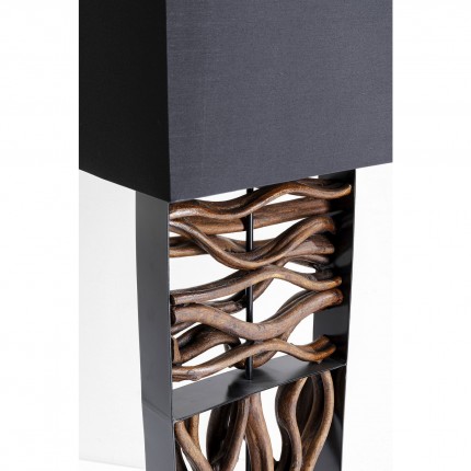 The linear steel structure contrasts with the raw reclaimed driftwood pieces. The black cotton shade completes the minimalist aesthetic of the fixture.