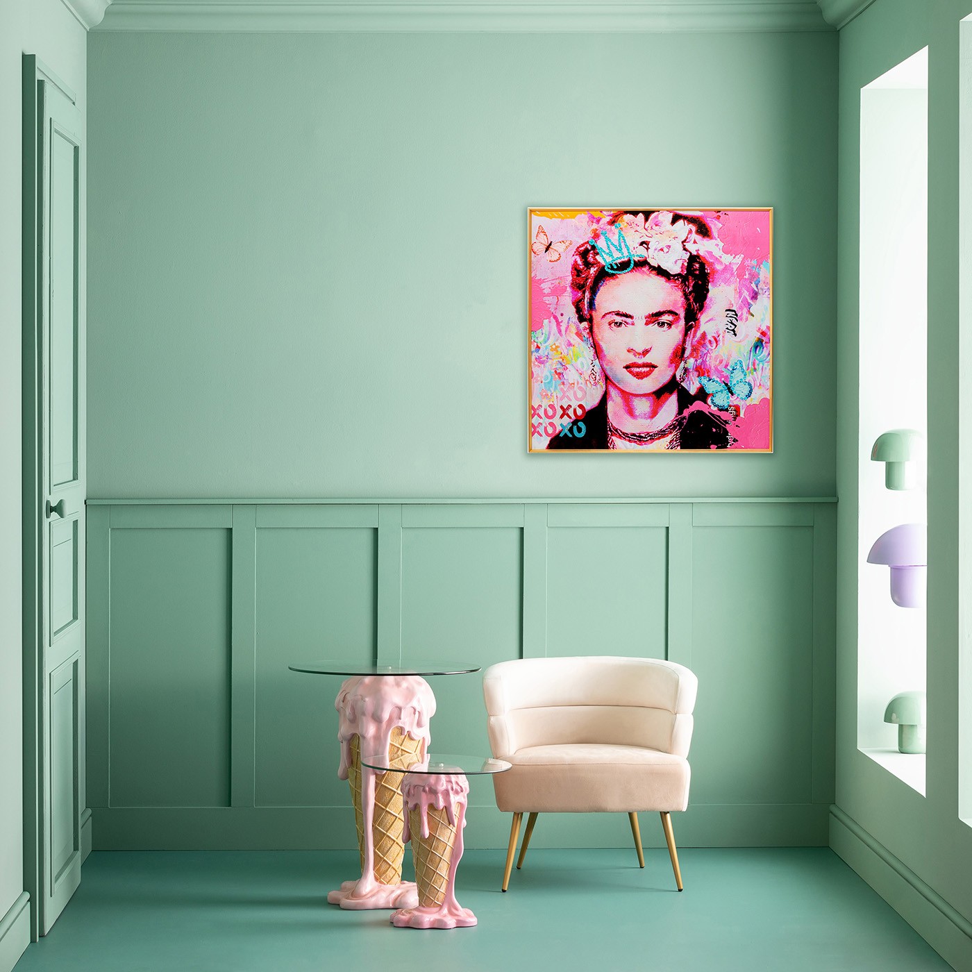 This side table will make your mouth water with its ice-cream-shaped base. The dripping strawberry scoop adds a playful, appetizing touch to your interior.