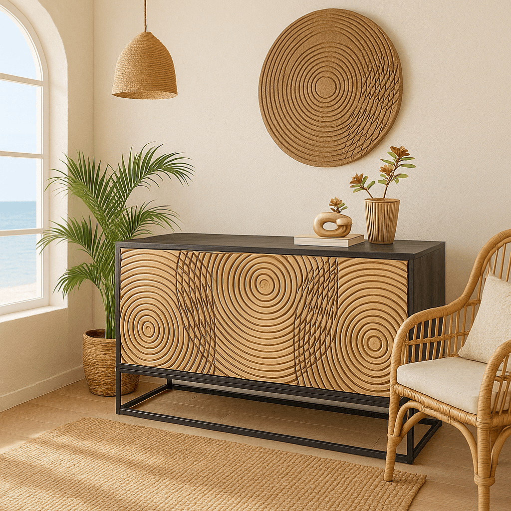 This contemporary design buffet combines an acacia structure with a mango tree facade, both lacquered, mounted on a steel base. Its three doors, which open with a touch of the finger, are decorated with raised circles.