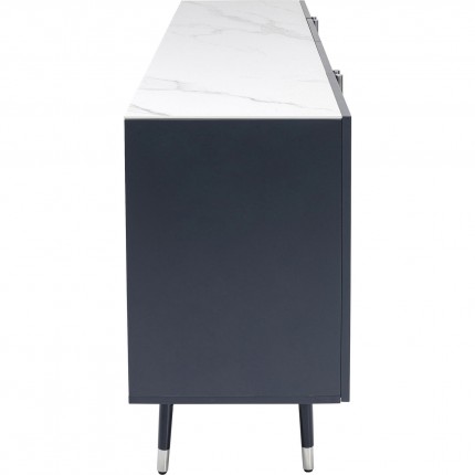 This modern dark grey sideboard with silver accents and marble-effect glass top was designed exclusively by Danish designer Morten Georgsen. Each set of doors opens into a large storage compartment with adjustable shelves.