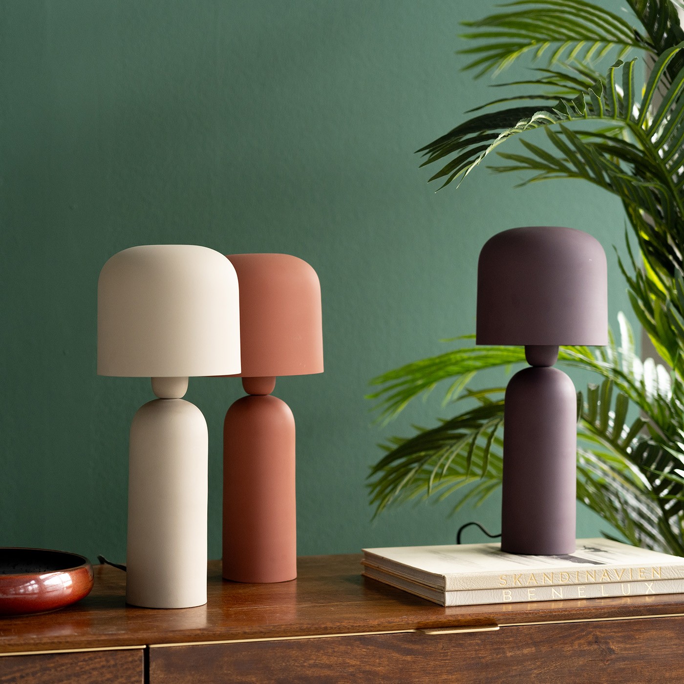 This lamp features a rounded, cap-shaped lampshade with a sleek design.