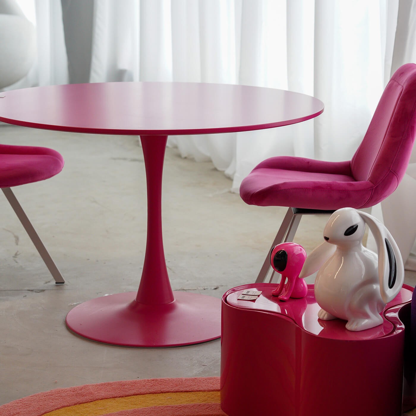 Sober and elegant, this table will fit in with contemporary decor. Its tulip-shaped central leg is made of lacquered steel, highlighted by a round top.