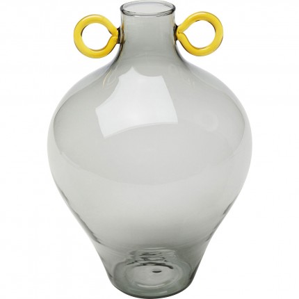 This vase blends elegance and originality with its transparent black glass and two small, bright yellow handles. An eye-catching graphic piece.
