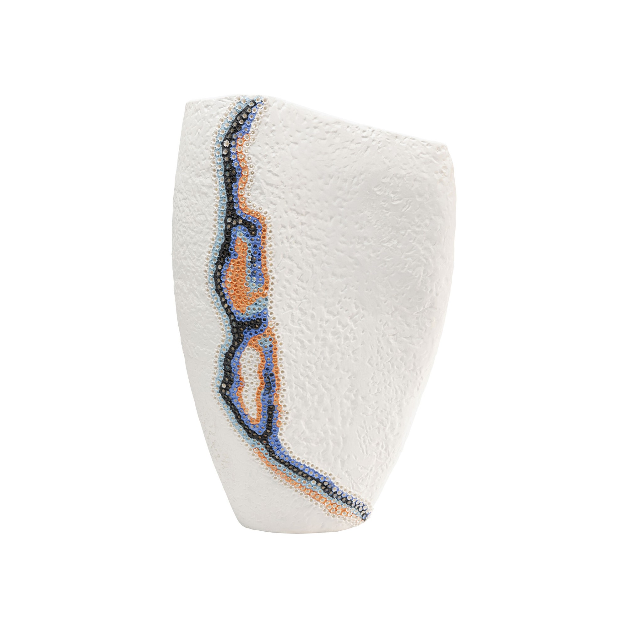 This elegant vase, inspired by the delicate shape of an anemone, brings a refined touch to your home. Adorned with a subtle line of small flowers colored in shades of orange and blue, it reveals a soft, contemporary floral beauty.