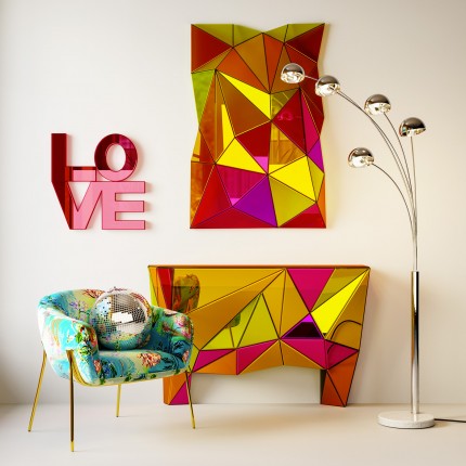 This wall decoration, full of love, completes your retro pep decor. The mirrored faces reflect a colorful light that changes from violet to pink, yellow and even green, depending on the angle.