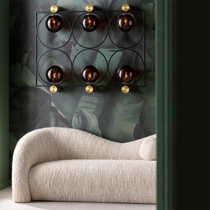 Let yourself be seduced by this boldly designed wall light: black steel circles house a brown glass sphere, where the lampholder hides. The whole is held in place by a golden cylindrical part that balances the whole.