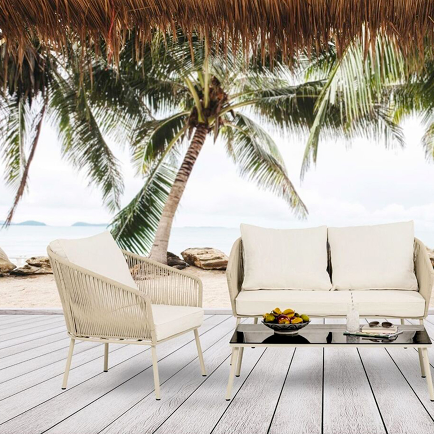 Deze tuinstoel valt op door zijn moderne loungestijl, ontworpen voor buitenruimtes zoals het terras, de tuin of het balkon, waar hij een ontspannen en elegante sfeer creëert. Hij heeft een stalen frame met poedercoating en een zitting en rugleuning van polypropyleen, voor sterkte en duurzaamheid. Gewatteerde kussens met afneembare hoezen voegen optimaal comfort toe en maken het onderhoud eenvoudig.