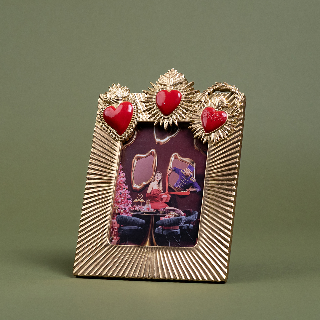 Voeg een vleugje onweerstaanbare charme toe aan je huis met dit fotolijstje met gouden omlijning en rode hartjes in reliëf. Het is meer dan alleen een houder voor je herinneringen, het is een decoratief object vol poëzie en elegantie. Romantisch, verfijnd en karaktervol, laat het je foto's zien en voegt het warmte en originaliteit toe aan je inrichting. Ideaal voor in een slaapkamer, woonkamer of hal, het is een echte blikvanger met zijn unieke ontwerp en zorgvuldige afwerking. Een lijst waar harten sneller van gaan kloppen.