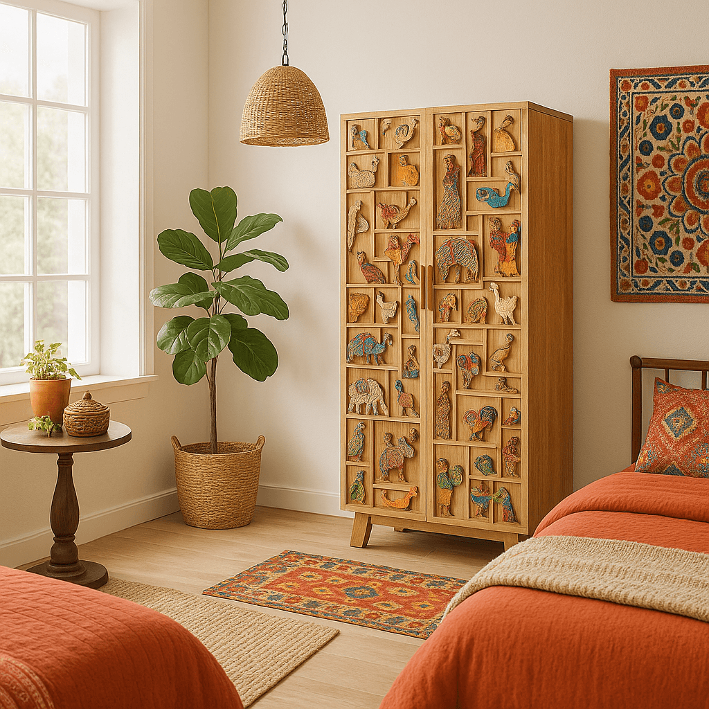 Deze houten kledingkast zal kinderen zeker bekoren, met dieren die in de voorkant zijn uitgesneden. Paarden, olifanten, giraffen, konijnen en dromedarissen voegen een kleurrijke, vrolijke sfeer toe aan de slaapkamer.