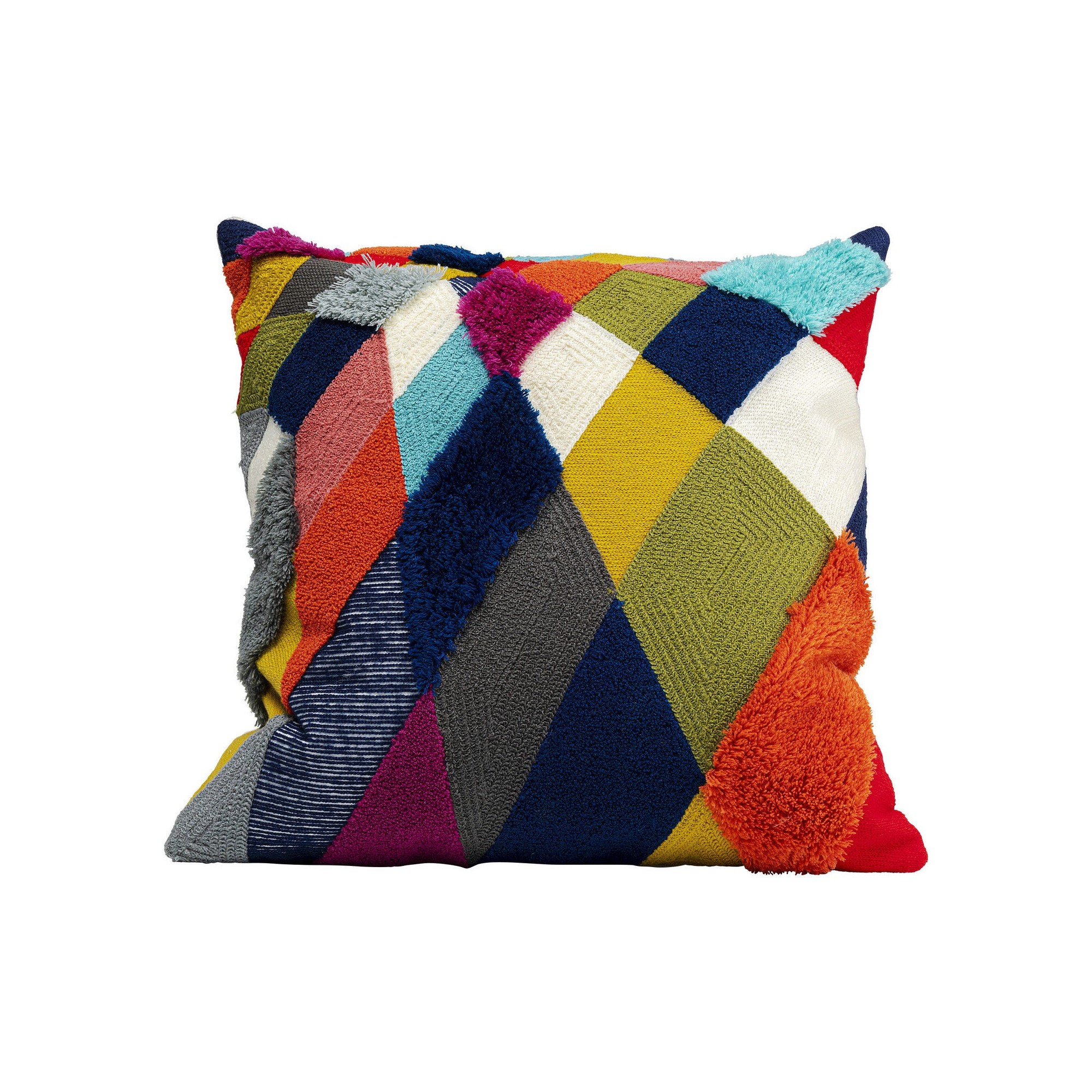 Dit kussen verleidt met zijn veelkleurige ruitvormige motieven in combinatie met een mix van texturen. Een visuele en tactiele ervaring. Het voegt meteen karakter toe aan een monochrome bank.