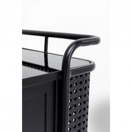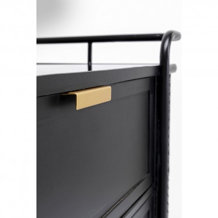 Deze ladekast combineert glas en staal om een retrogevoel in huis te brengen. De poten zijn aangevuld met vergulde uiteinden die elegantie toevoegen. De zijkanten zijn geïnspireerd op geweven rotan om het silhouet lichter te maken.