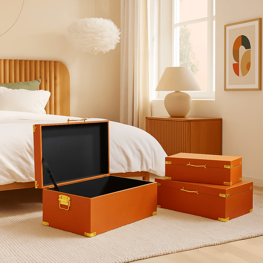 Voeg een levendig tintje toe aan je interieur met onze set fel oranje dozen. De imitatiebekleding van reptielenhuid wordt geaccentueerd met gouden handgrepen en hoeken.