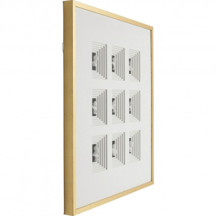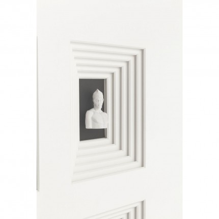 Dit schilderij neemt je mee naar de oudheid met de 9 witte bustes in reliëf op een zwarte achtergrond. Het geheel is geplaatst onder een glazen ruit, in een lijst met een gouden omlijsting. De combinatie van de drie kleuren resulteert in een pure elegantie.
