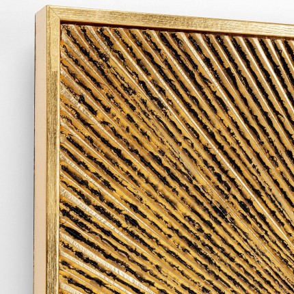 Dit gouden schilderij zal u betoveren met zijn stralen ontwerp dat zich over het gehele oppervlak uitstrekt om een effect te geven van diepte-effect. Het reliëf en de antieke afwerking maken het tot een kunstwerk dat een elegante en zuivere stijl aan uw kamer zal geven.