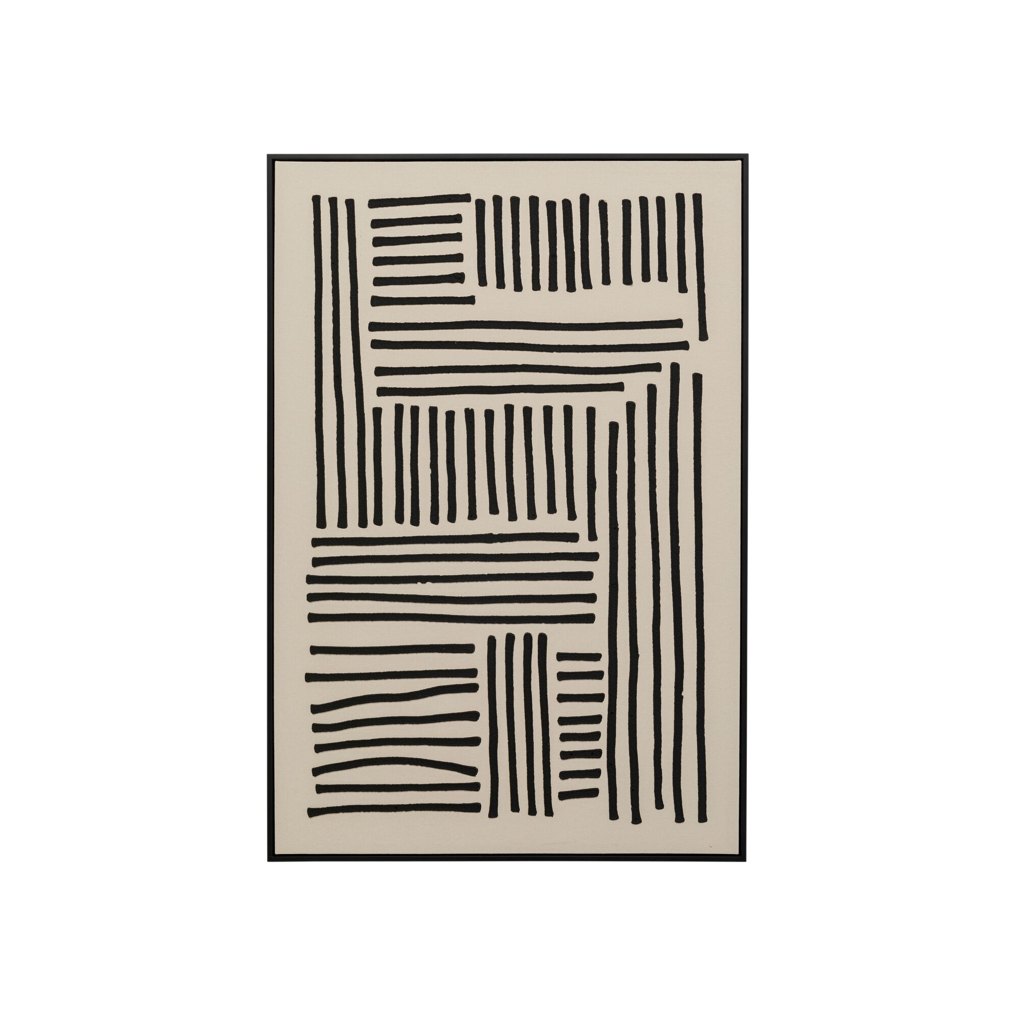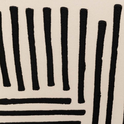 Dit schilderij in etnische stijl bestaat uit talloze zwarte lijnen in reliëf op een crèmekleurige achtergrond in verschillende en gevarieerde richtingen, waardoor het een zebra-achtig uiterlijk heeft.
