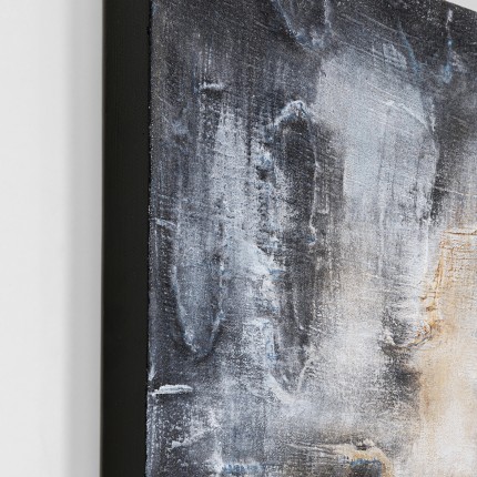 Dit canvas met schilderachtige details verkent de schoonheid van texturen en vormen door een subtiel spel van grijs en blauw.