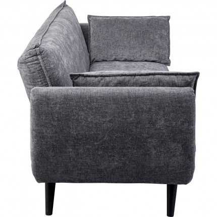 Deze slaapbank in donkergrijze stof biedt overdag slaapruimte aan 3 personen in de slaapbank en aan 2 personen in de slaapbank. De 2 kussens kunnen als hoofdkussen gebruikt worden.