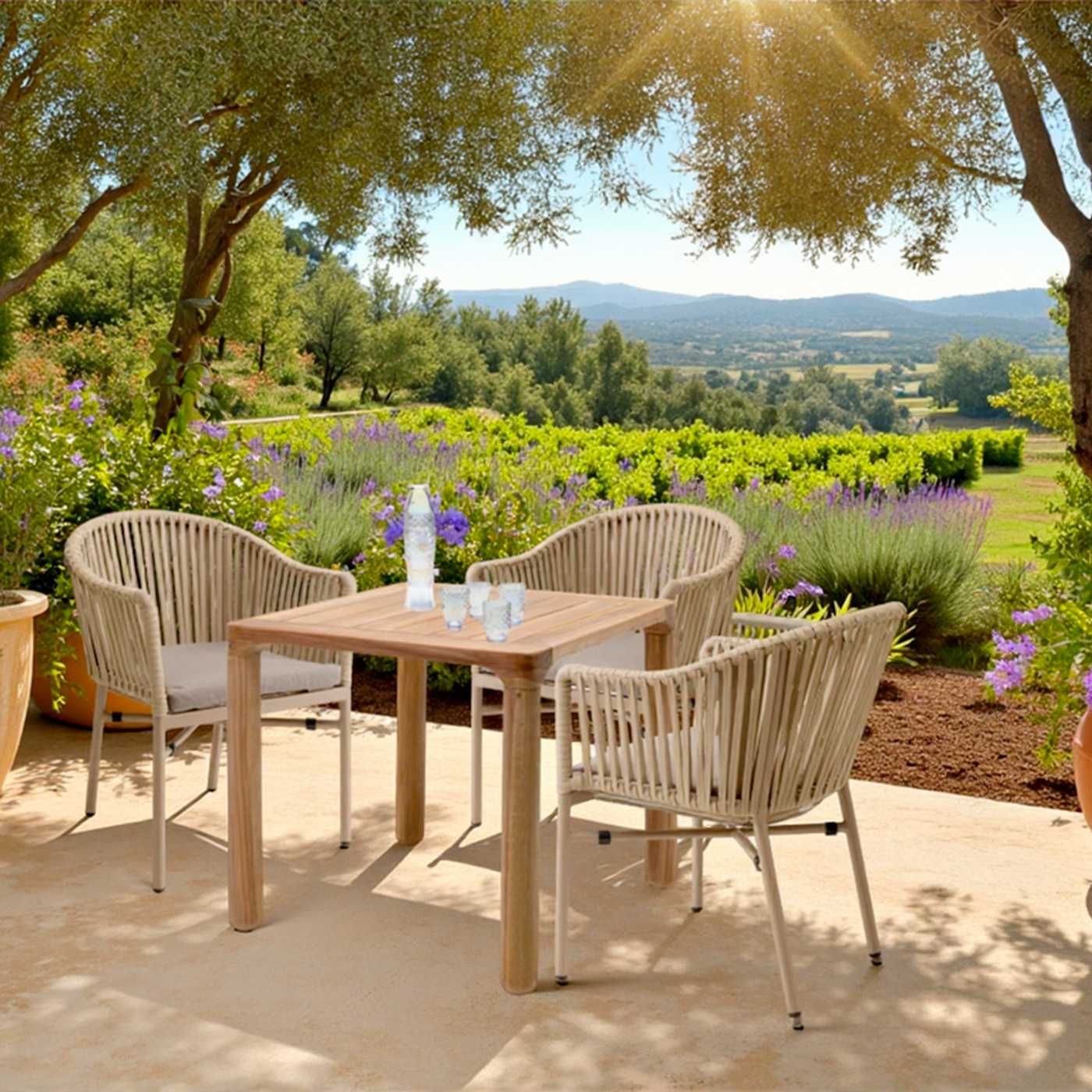 Deze comfortabele tafelstoel voor buiten zal je overtuigen met zijn zacht gebogen silhouet en luchtige uitstraling. Het fijne vlechtwerk maakt hem licht en creëert een moderne en warme buitensfeer. De slanke poten en het stevige frame contrasteren met de zachte lijnen. De armleuningen en comfortabele zitting bieden optimaal comfort en nodigen uit om te ontspannen. De gemakkelijk te onderhouden geweven stof is ideaal voor buitengebruik en benadrukt de eenvoud van de stoel.