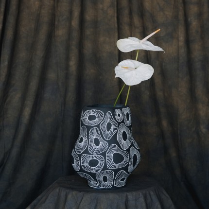 Deze grijze vaas valt op door zijn organische vorm en abstracte witte anemoonmotieven.