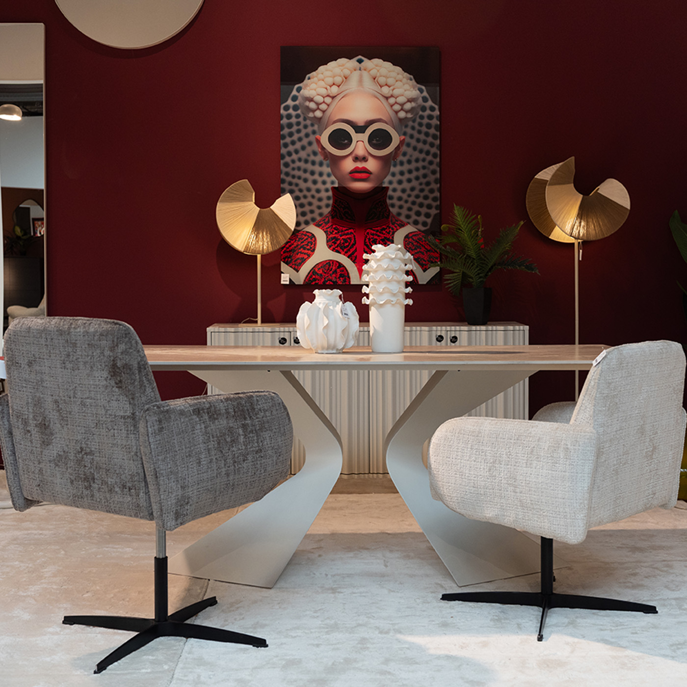• Een vloerlamp met gebogen lijnen en een duidelijk silhouet.