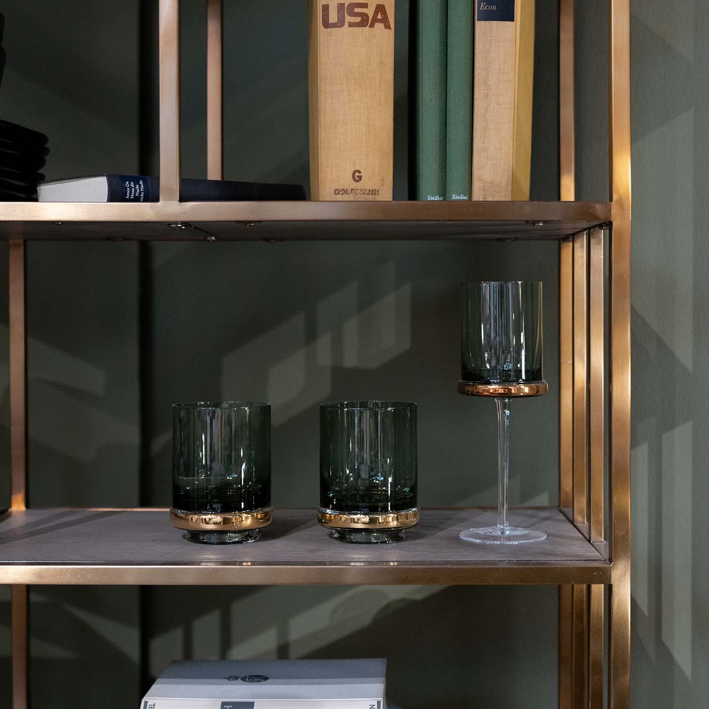 De glazen uit de Innocent-serie geven je servies een elegant tintje met hun groen gerookte glas en gouden band.